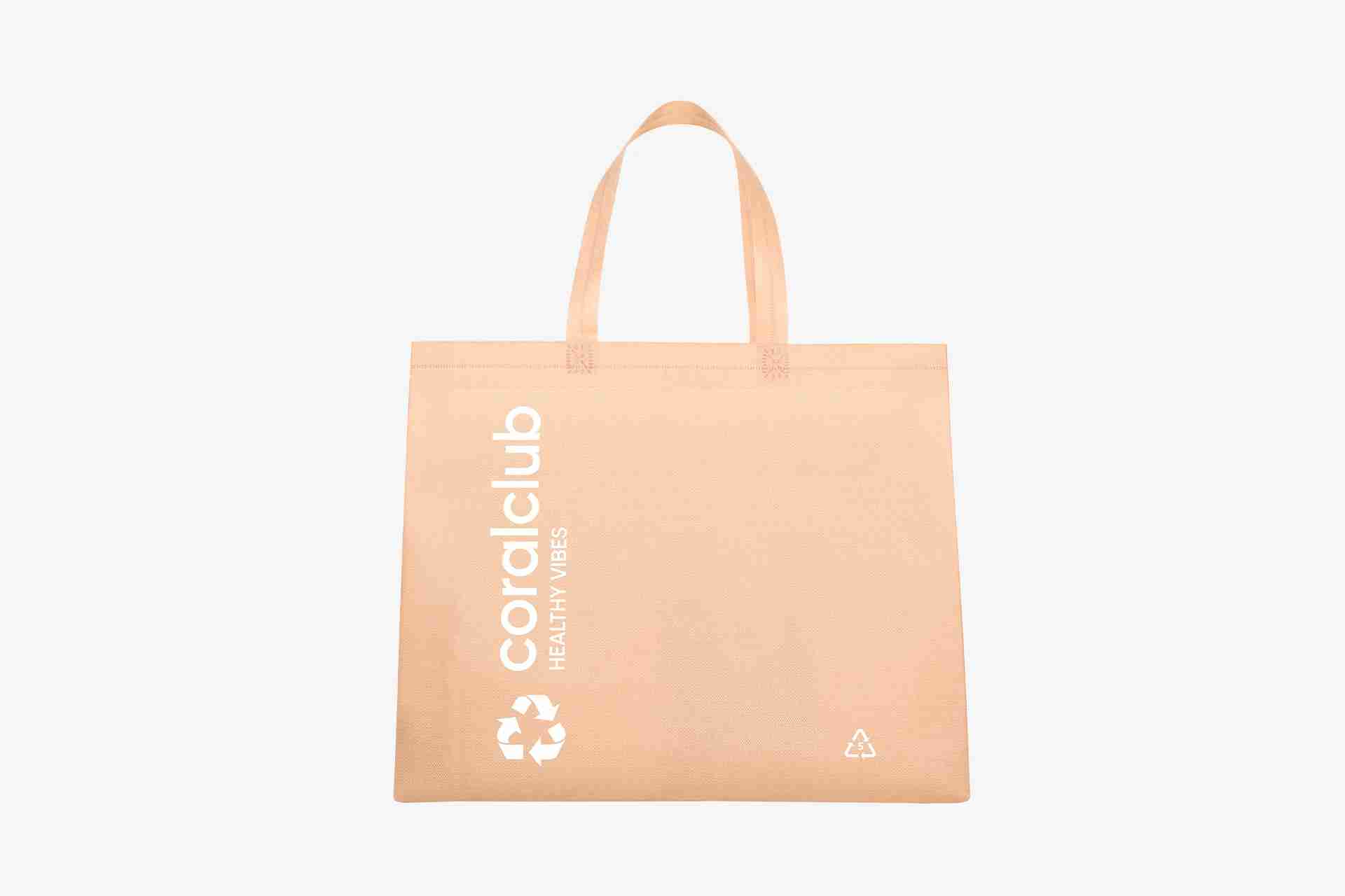 Sturdy reusable spunbond bag with long handles.